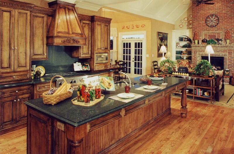Similar to craftsman style with more rough saw exposed wood, log style uneven lines darker colors and large great room and large exposed beams, rough stone fireplace features.